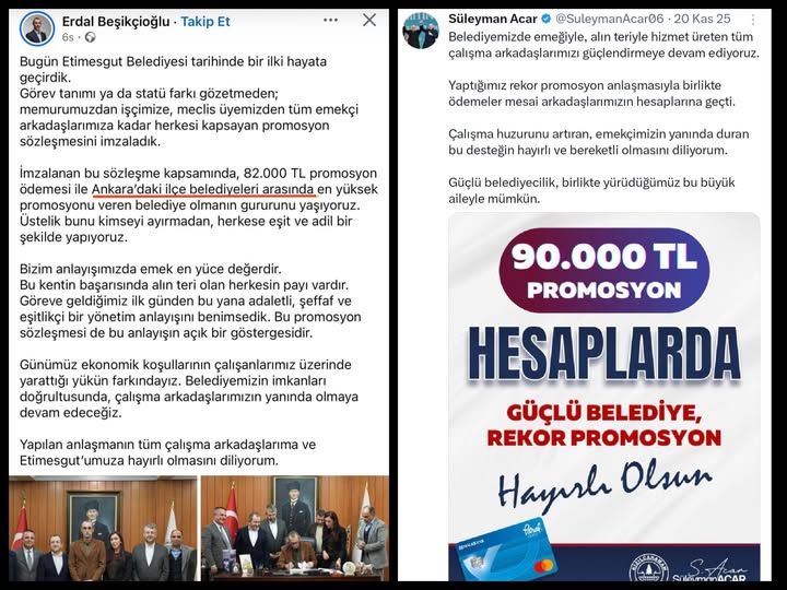 Etimesgut Belediye Başkanı Erdal Beşikcioğlu sosyal medya hesabından yapmış olduğu Belediye Personellerine verilen 82.000 TL Banka promosyonu ile ilgili Ankara İlçeler arasında en yüksek promosyonu aldığını duyurması ile Kızılcahamam Belediye Başkanı Süleyman Acar personeline 90.000 TL promosyon aldığını ve Ankara'nın en yüksek promosyon alan ilçesi Kızılcahamam Belediyesi olduğunu ifade etti.