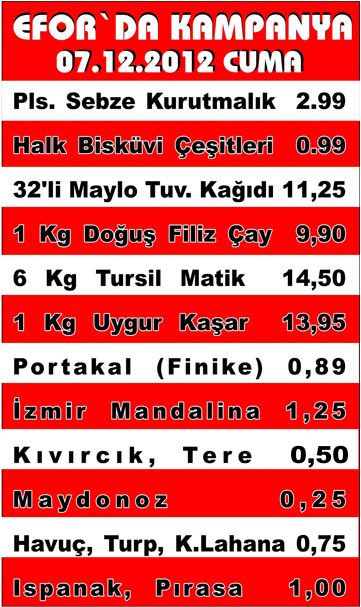 Efor Alışveriş Dünyası 07.12.2012 günü indirimdeki ürünler;