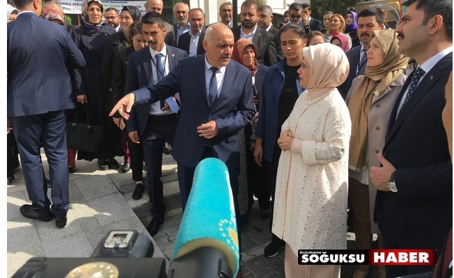 Kızılcahamam Belediye binası önünde Çevre ve Şehircilik Bakanı Murat Kurum, Ankara Milletvekilleri Lütfiye Selva Çam, Asuman Erdoğan, Zeynep Yıldız, Barış Aydın, Bakan eşleri, Milletvekili eşleri, İlçe Kaymakamı Can Aksoy, Belediye Başkanı Süleyman Acar, AK Parti İlçe Başkanı Ahmet Barun, Belediye Meclis Üyeleri, AK Parti Kızılcahamam Gençlik Kolları Başkanı Taha Sarı ve AK Parti Kızılcahamam Kadın Kolları Başkanı Merve Koçak tarafından karşılanan Emine Erdoğan, belediye önünde sıfır atıkla ilgili yapılan çalışmalar hakkında Belediye Başkanı Süleyman Acar’dan bilgi aldı ve kullanılan araç-gereçleri inceledi.