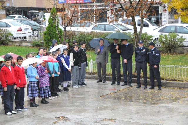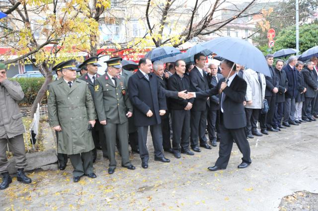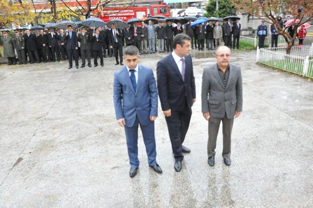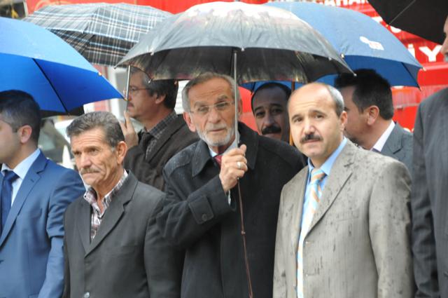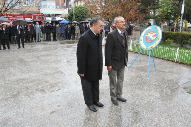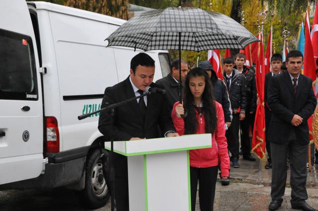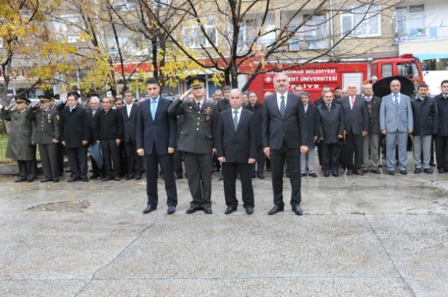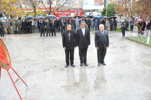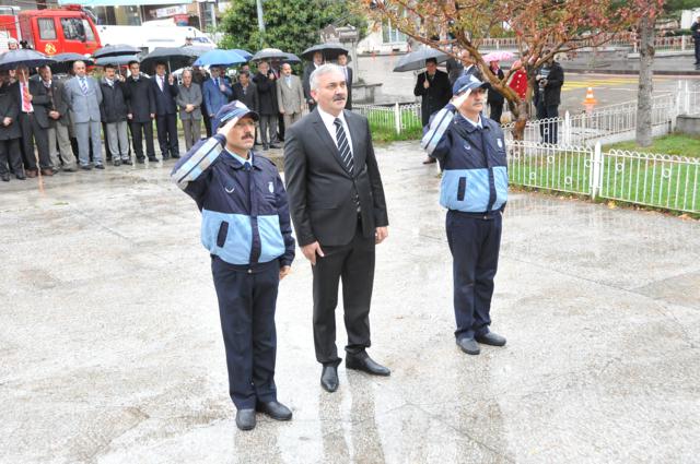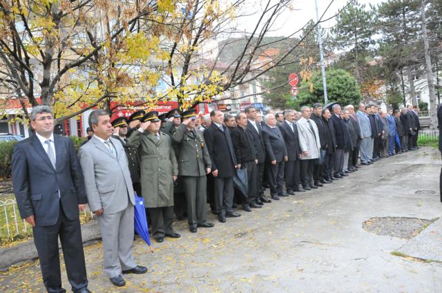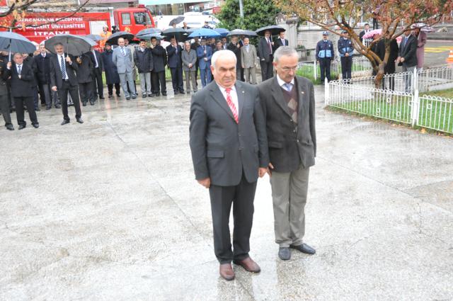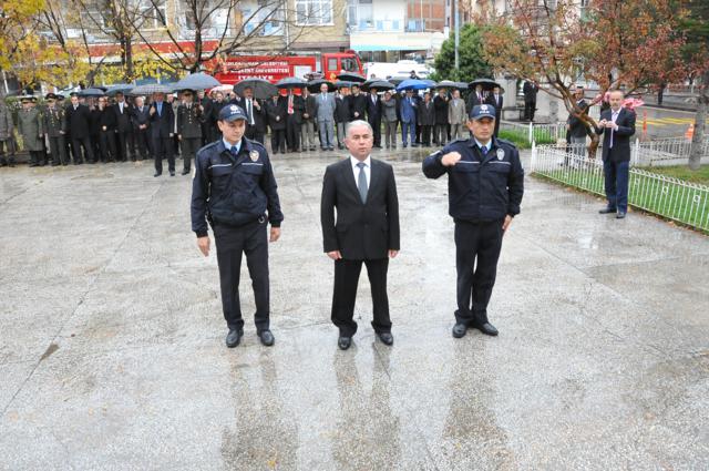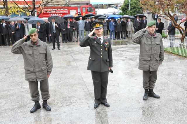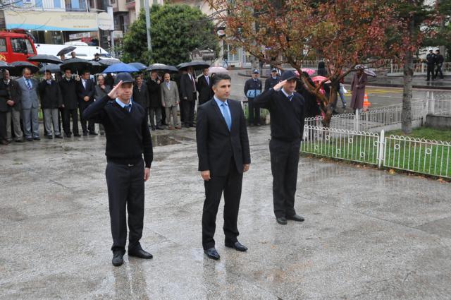 Yağmur altında düzenlenen törene protokol tarafından çelenkler konuldu. Atatürk Anıtı önündeki tören, saygı duruşuyla başladı. Saat 09.05’i gösterdiğinde İlçede hayat durdu. Törene katılanların yanı sıra çevredeki vatandaşlar da sirenlerin çalmasıyla araçlarından inip saygı duruşuna geçti