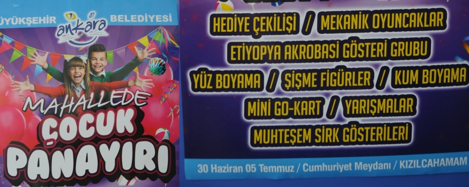 Ankara Büyükşehir Belediyesi ilçelerde kurduğu “MAHALLEDE ÇOCUK PANAYIRI’NI ” Kızılcahamam’a taşıdı. Panayır, oyun gruplarıyla  minik ziyaretçilerini ağırlayacak. Muhteşem sirki, akülü arabalar, şişme oyuncaklar ile pek çok lunapark oyuncağının yer aldığı panayır alanındaki sahne gösterileri ile akrobasi ve muhteşem sirk grubu, heyecanlı bir atmosfer ile konuklarını ağırlayacak.