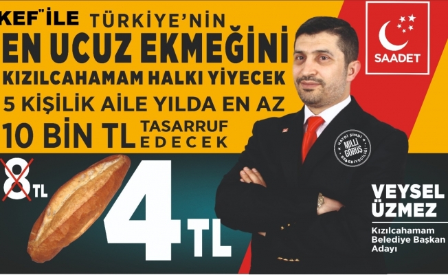 Kızılcahamam'ın projelerini daha önceden yayınladığımız Sadet Partisi Kızılcahamam Belediye Başkan Adayı Veysel Üzmez son olarak yaptığı tanıtım toplantısında da açıkladığı KEF ile Ekmek %50 indirimli olacağını ve 4 tl'ye satılacağını belirtti.